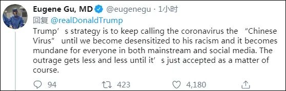 “特朗普的策略就是继续称这种冠状病毒为所谓‘中国病毒’,直到我们对他的种族主义变得麻木,让主流媒体和社交媒体上的每个人都觉得这是平常事。表达愤怒的人变得越来越少,它就被‘理所当然地接受’了。”