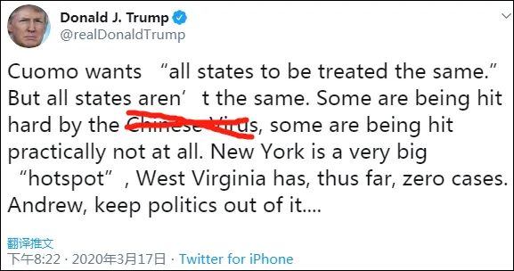 3月17日,特朗普发推点名了日前防疫工作亮眼的纽约州长科默(Andrew Cuomo)称,“科默希望‘所有州都能同等应对’。但并不是所有州都一样。有些受到了所谓‘中国病毒’的严重打击,有些则几乎没有任何影响。纽约州是一个非常大的‘热点地区’,而西弗吉尼亚州到目前为止都没有病例。安德鲁(即科默),别把政治扯进来……”