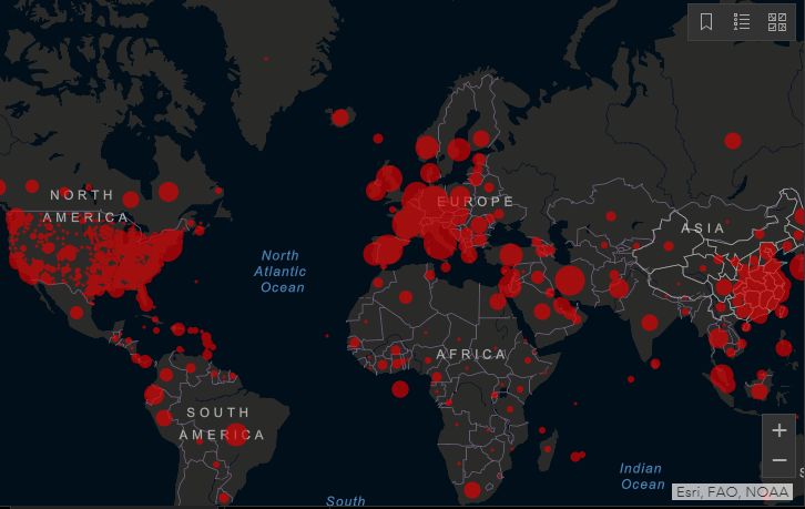 这些数据来自约翰斯·霍普金斯大学新冠病毒研究项目实时汇总的各个国家和地区数据。