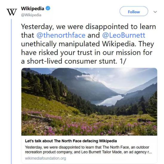 “一个品牌如何不花钱就在谷歌上出现在第一位呢?” The North Face 自卖自夸,“我们到达了最难企及的地方之一:世界最大搜索引擎的‘顶端’。仅仅通过和维基百科合作,完全不需要支付任何费用。”