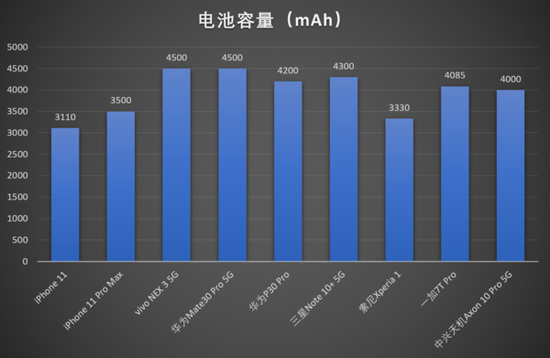 我先从这款9款手机的电池容量说起,iPhone 11电池容量为3110mAh,iPhone 11 Pro Max电池容量为3500mAh,索尼Xperia 1为3330mAh,一加7T Pro和中兴天机Axon 10 Pro 5G的电池容量都达到了4000mAh级别,华为P30 Pro电池容量达4200mAh,三星Galaxy Note10+ 5G也达到了4300mAh,华为Mate30 Pro 5G和vivo NEX 3 5G的电池容量最大,均达到了4500mAh。