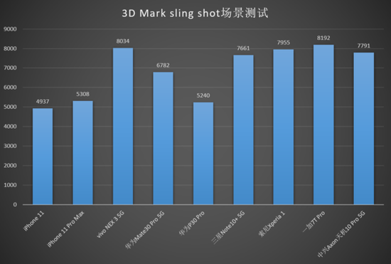 在图形性能表现上,一加7T Pro和vivo NEX 3 5G表现突出,图形性能成绩均超过了8000分;三星Galaxy Note10+ 5G、中兴天机Axon 10 Pro 5G、索尼Xperia 1等高通骁龙855机型分数差别不大,分数均接近8000分;华为Mate30 Pro 5G和华为P30 Pro在这一环节稍逊一筹;A13仿生图形性能表现同样也十分强劲,但是由于测试标准不同,所以只作用于参考。
