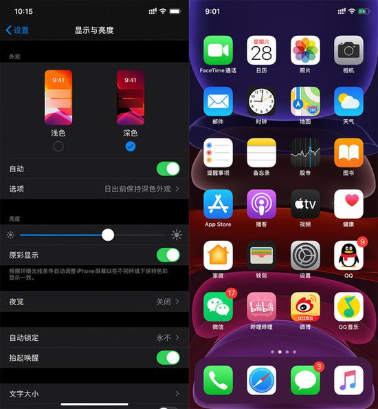 iOS 13的全局暗黑模式是其一大亮点所在,该功能开启后,iPhone 11和iPhone 11 Pro Max的系统界面、系统程序页、键盘、自带应用等的背景色都会变成黑色。除了手动设定,暗黑模式还能根据日出日落时间进行开启和关闭,有时候不用看时间,看一下手机背景就知道太阳下山了。