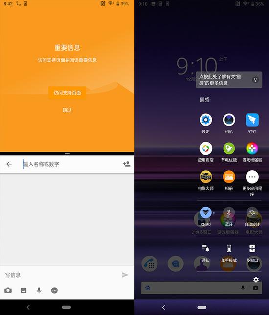 在功能性上,索尼Xperia 1还为我们带来侧面感应功能,通过点击屏幕边缘可呼出应用列表,可根据你最近的使用情况、时间、地点和其他手机使用方式,选择你最想使用的应用程序。另外,还能选择两个应用进行分屏使用,同时操作两个应用程序。