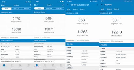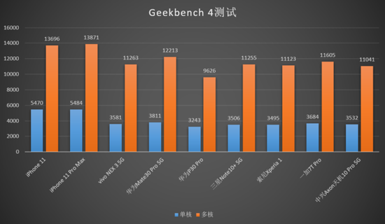 本次横评我们采用GeekBanch 4测试这几款手机的处理器性能,测试结果如上图所示,从整体上看,iPhone 11和iPhone 11 Pro Max搭载的A13仿生力压群雄,单核跑分突破5000大关,多核性能超过13000分。