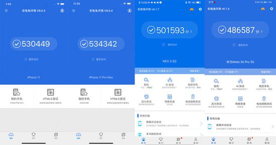 从左到右:iPhone 11、iPhone 11 Pro Max、vivo NEX 3 5G、华为Mate30 Pro 5G