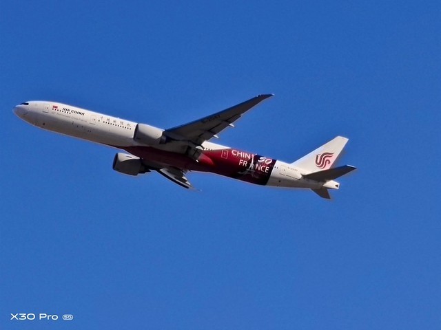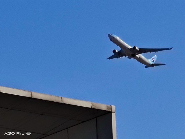 第三个场景同样对长焦拍摄充满了挑战,笔者选取了高速运动场景下的长焦拍摄,来到了北京市顺义区,在距离机场约5公里的地方拍摄飞机,5公里是一个折中的距离,它既避免了距离太近而发挥不出长焦的优势,同时它又十分具有难度,因为飞机在起飞过程中速度很快,很难追焦。在这样的场景下,可以感受到vivoX30 Pro的各焦段镜头切换十分顺畅柔滑,一边遥摄追焦,一边不断地切换镜头焦段,可捕捉飞机起飞时的不同姿态和放大倍率,无论是带有前景的拍摄还是给飞机来个特写都可以轻松搞定,而且拍摄的画面细节十分突出,从拍摄样片中可以清晰看到飞机的涂装、航空公司信息等细节。