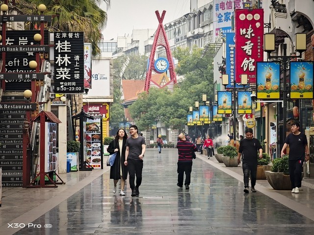 对于vivoX30 Pro而言,它最具吸引力的便是这颗潜望式长焦镜头,它可以带领你的视线去远方,发现远方更多的美好,在实拍过程中,笔者选取了几个原本只有专业摄影师使用长焦镜头所能拍摄的场景进行拍摄,在实操中体验它的长焦拍照能力。首先,笔者来到了桂林著名的东西巷步行街,在步行街的最远处约500米的位置拍摄街中心的钟表塔,分别以超广角、1倍、5倍、60倍变焦拍摄,5倍变焦下,画面空间视角十分合适,发挥了长焦镜头压缩空间的优势,60倍数码变焦可以清晰的看到钟表时间的细节,画面清晰,堪比望远镜效果。