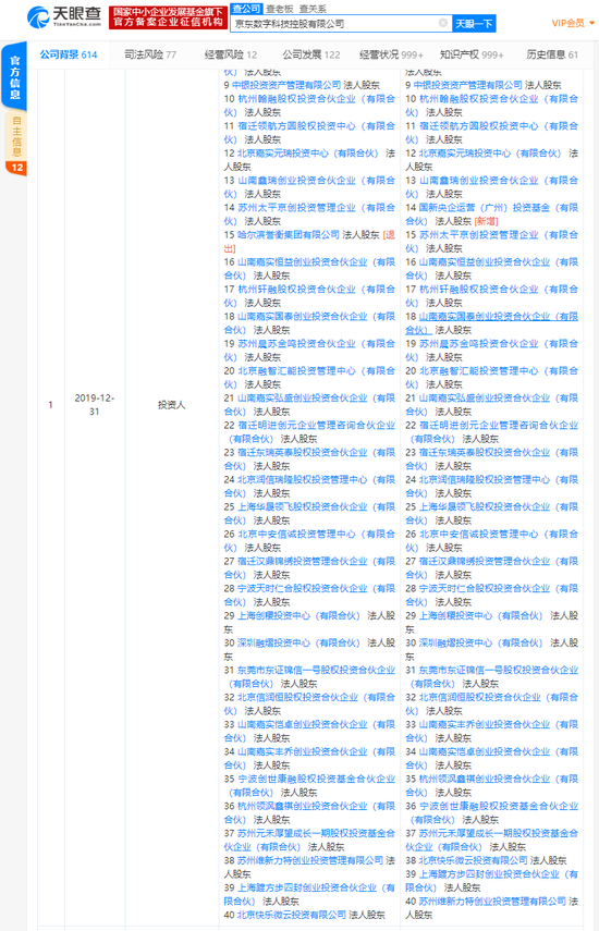 科技讯 1月9日上午消息,天眼查数据显示,12月31日,京东数科的运营主体京东数字科技控股有限公司发生工商变更,投资人哈尔滨誉衡集团有限公司退出,新增投资人为国新央企的投资实体之一国新央企运营(广州)投资基金(有限合伙)。