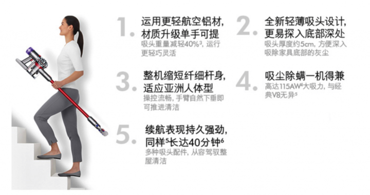 在戴森来看,亚洲人的身体相比欧美人更加纤细,所以他们会倾向于更轻便的产品,同时这款全新的 V8 Slim 更加轻便灵活通,能够更好的适应亚洲家庭的居住环境而 就是由此衍生出的一款产品。