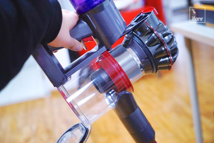 V8 Slim 的集尘桶的设计和 V8 Fluffy 相同,往上提红色的把手部分下面的盖子就会自动打开,从方便性来说不如改进之后的 V11,不过无论是 V8 还是 V11,倾倒垃圾的时候都要注意放低到垃圾桶内部,尽量避免二次扬尘。