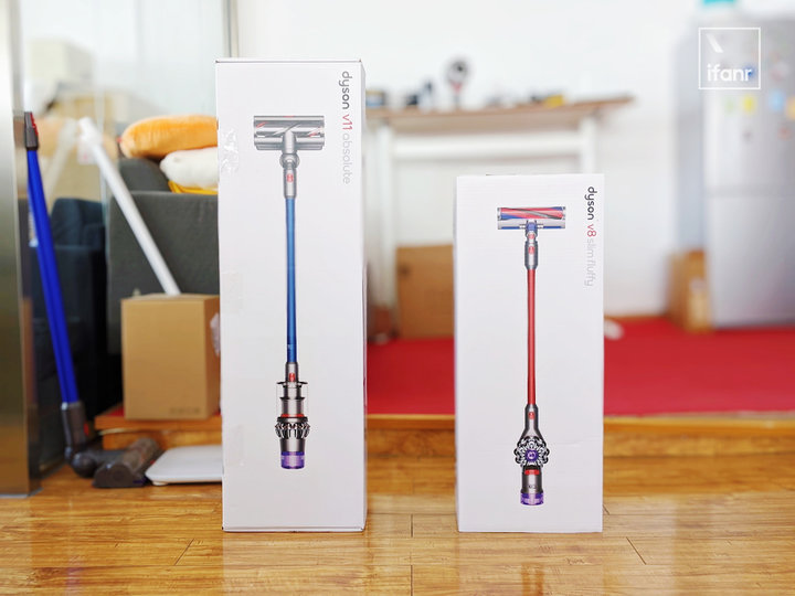 虽然目前手里没有 V8 Fluffy,但如果把 V8 Slim 和办公室的 V11 absolute 这两款产品的包装盒放在一起比较,看起来就像是大哥哥和小妹妹站在一起,在视觉与物理空间上的差异,造就了两款产品定位上的不同。