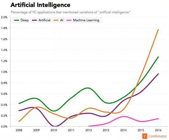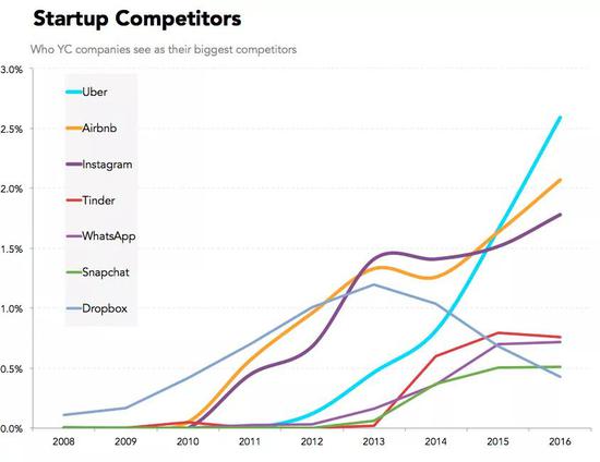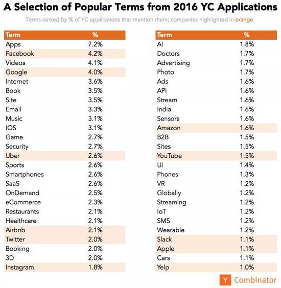在这份研究中,YC 另外还专门统计了一些关键词,发现 2016 年 Facebook 和谷歌(4%)仍然是被引用次数最多的公司。而 Uber、Airbnb 以及 Slack 正在迅速崛起。