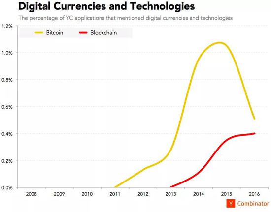 从词频来看,大概在 2016、2017 年,专注于 blockchain 的项目已经开始超越 bitcoin。但这只反映在申请 YC 的数万创业者的共识中。2017 年底、2018 年初,bitcoin 价格才在公众目光中窜上顶峰,中间又是两年时间的 Gap。