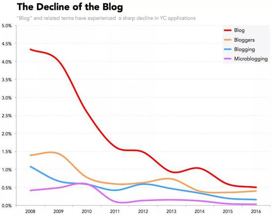 第四个问题和博客有关,曾经许多申请 YC 的创业项目都和 Blog 有关,但这个趋势早已不再流行。