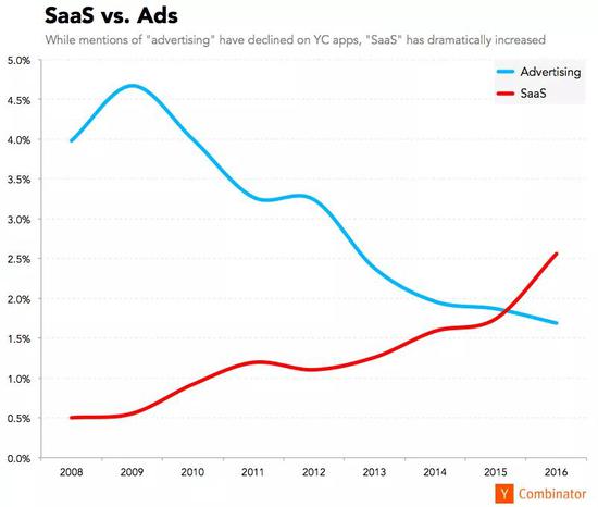 第三个问题,关于商业变现,依靠广告和依靠 SaaS 直接面向客户收费的公司,比例变化非常明显。