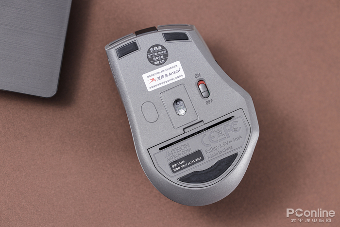 翻到鼠标背后,可以看到FG30s无线鼠标除了配置了脚垫和开关按键之外,还能看到电池仓的设计。按照双飞燕的说法,FG30S无线鼠标电池的最长寿命可以达到18个月,而在小编看来,其实采用电池拆卸设计,也更加方便日常使用。