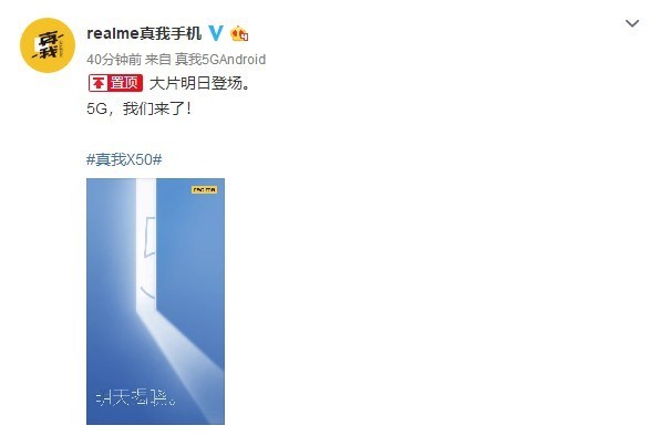 一个月前,realme官宣旗下首款5G手机取名为realme真我X50,该机支持SA、NSA双模5G网络,将于年前发布,具体发布时间还未宣布。不过现在距离春节只有大概一个月的时间了,realme真我X50的发布时间应该也不远了。12月23日,realme发微博称“大片明日登场。5G,我们来了!”从文字来看,realme或于明天官宣新机的具体发布时间。
