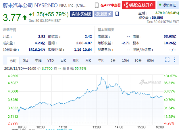 科技讯 北京时间12月31日凌晨消息,蔚来汽车(NYSE:NIO)周一开盘股价大涨20.66%,截止收盘,蔚来股价报收3.77美元,涨幅达55.79%。