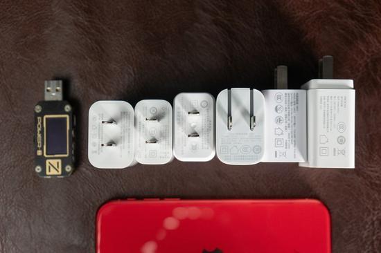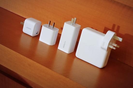 上图从左至右依次是“ANKER GaN充电器 30W” 、“苹果原装18W快充” 、“联想ThinkPlus 65W快充”和“苹果笔记本充电器”。