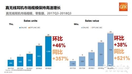 根据GFK统计,截至2018年9月,中国真无线耳机市场零售量达280万台,零售额近16亿,同比增速超630%。按照数据计算比对,2017年的时候中国真无线耳机零售量达仅约为45万台。根据《中国耳机行业发展情况(2018版)》的数据,2017年无线耳机产量为2.72亿条。45万台对比2.72亿条,2017年的真无线耳机销售明显仅是九牛一毛。