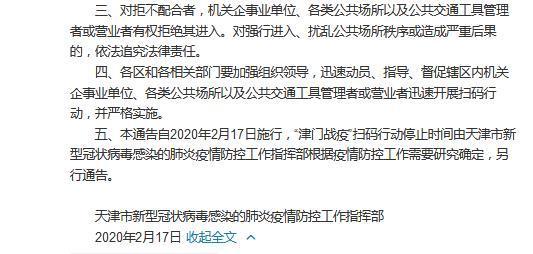 该通告自2020年2月17日施行,“津门战疫”扫码行动停止时间由天津市新型冠状病毒感染的肺炎疫情防控工作指挥部根据疫情防控工作需要研究确定,另行通告。