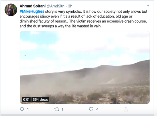 更有网友直言,迈克休斯的死亡是整个社会的问题:“这件事太有象征意义了。这意味着我们的社会不仅允许并且鼓励愚昧的行为,愚昧是由于教育的缺失,年龄大,或是理智的缺失。”