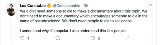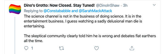 网友 DinoInShaw 抨击科学频道称:“科学频道根本不是科学,是娱乐化的生意。我猜(有些人)看着一位可悲的抱有妄想的人去世很有趣吧。”