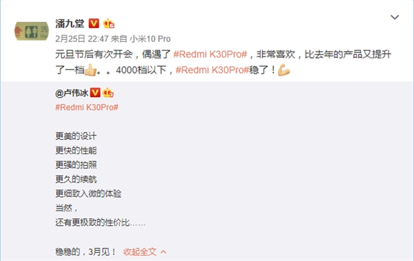 小米产业投资部合伙人潘九堂微博表示,元旦节后有次开会偶遇了Redmi K30 Pro,非常喜欢,相比去年的产品又提升了一档,4000元以下Redmi K30 Pro稳了。