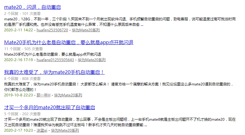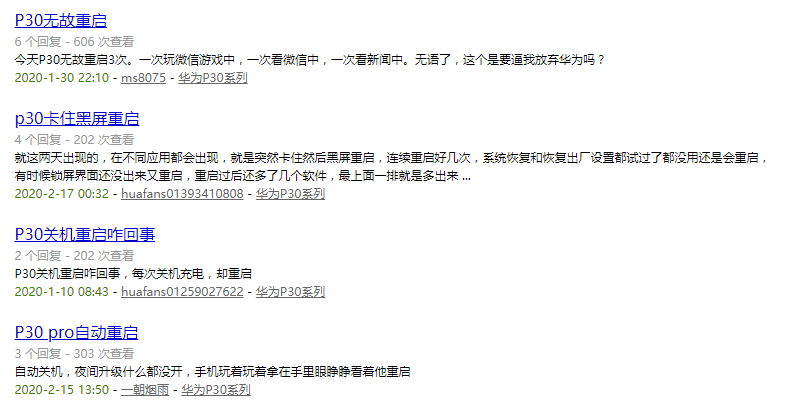 在华为官方论坛,P30、P20、Mate 20、P10等机型均被曝存在多次重启的问题