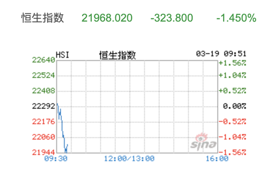 科技讯 3月19日上午消息,香港恒指低开低走,截止9:53,恒指跌1.45%或323.80点,报21968.02点。失守22000点关口,为2017年1月以来首次。