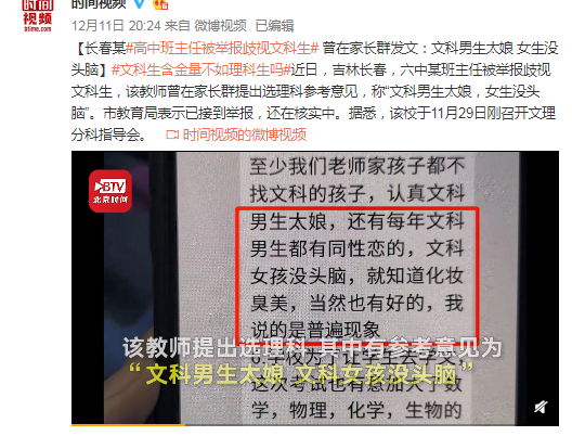 近日,吉林长春,六中某班主任被举报歧视文科生,该教师曾在家长群提出选理科参考意见,称“文科男生太娘,女生没头脑”。市教育局表示已接到举报,还在核实中。据悉,该校于11月29日刚召开文理分科指导会。