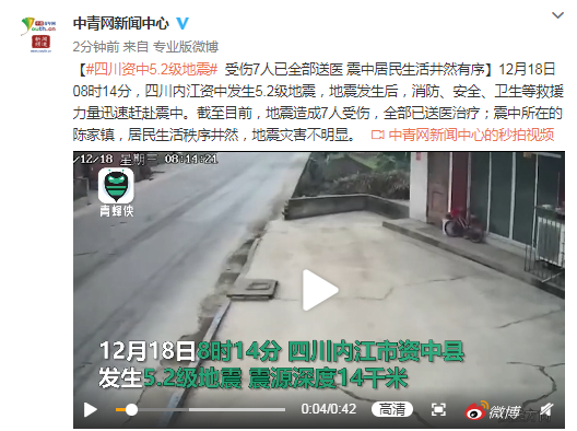 12月18日08时14分,四川内江资中发生5.2级地震,地震发生后,消防、安全、卫生等救援力量迅速赶赴震中。截至目前,地震造成7人受伤,全部已送医治疗;震中所在的陈家镇,居民生活秩序井然,地震灾害不明显。