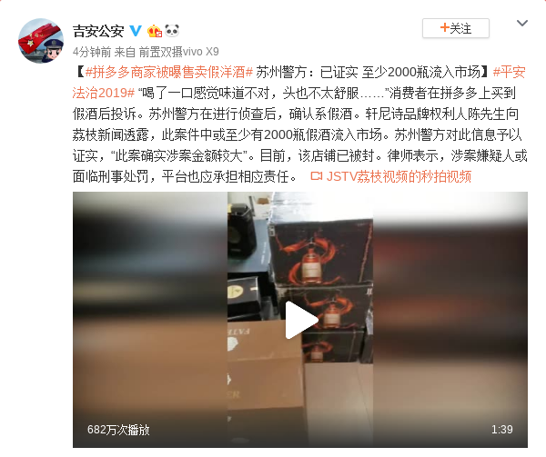“喝了一口感觉味道不对,头也不太舒服……”消费者在拼多多上买到假酒后投诉。苏州警方在进行侦查后,确认系假酒。轩尼诗品牌权利人陈先生向荔枝新闻透露,此案件中或至少有2000瓶假酒流入市场。苏州警方对此信息予以证实,“此案确实涉案金额较大”。目前,该店铺已被封。律师表示,涉案嫌疑人或面临刑事处罚,平台也应承担相应责任。