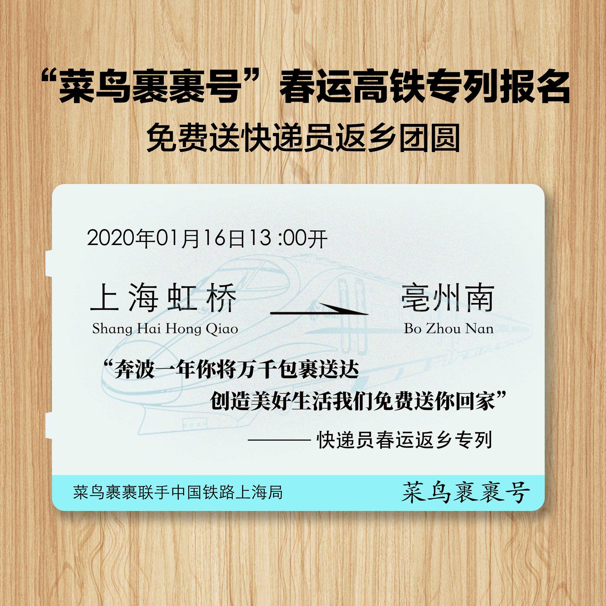 该趟高铁专列始发站为上海虹桥,开往安徽亳州南。由菜鸟裹裹出资购票,快递员及家属可免费乘坐。上海及周边地区的快递员,可通过菜鸟裹裹所属的“菜鸟包裹侠”APP在线报名。快递员只需填写基本报名信息,报名成功后,中国铁路上海局将第一时间安排出票。此外,每位快递员可携带两名家属上车。