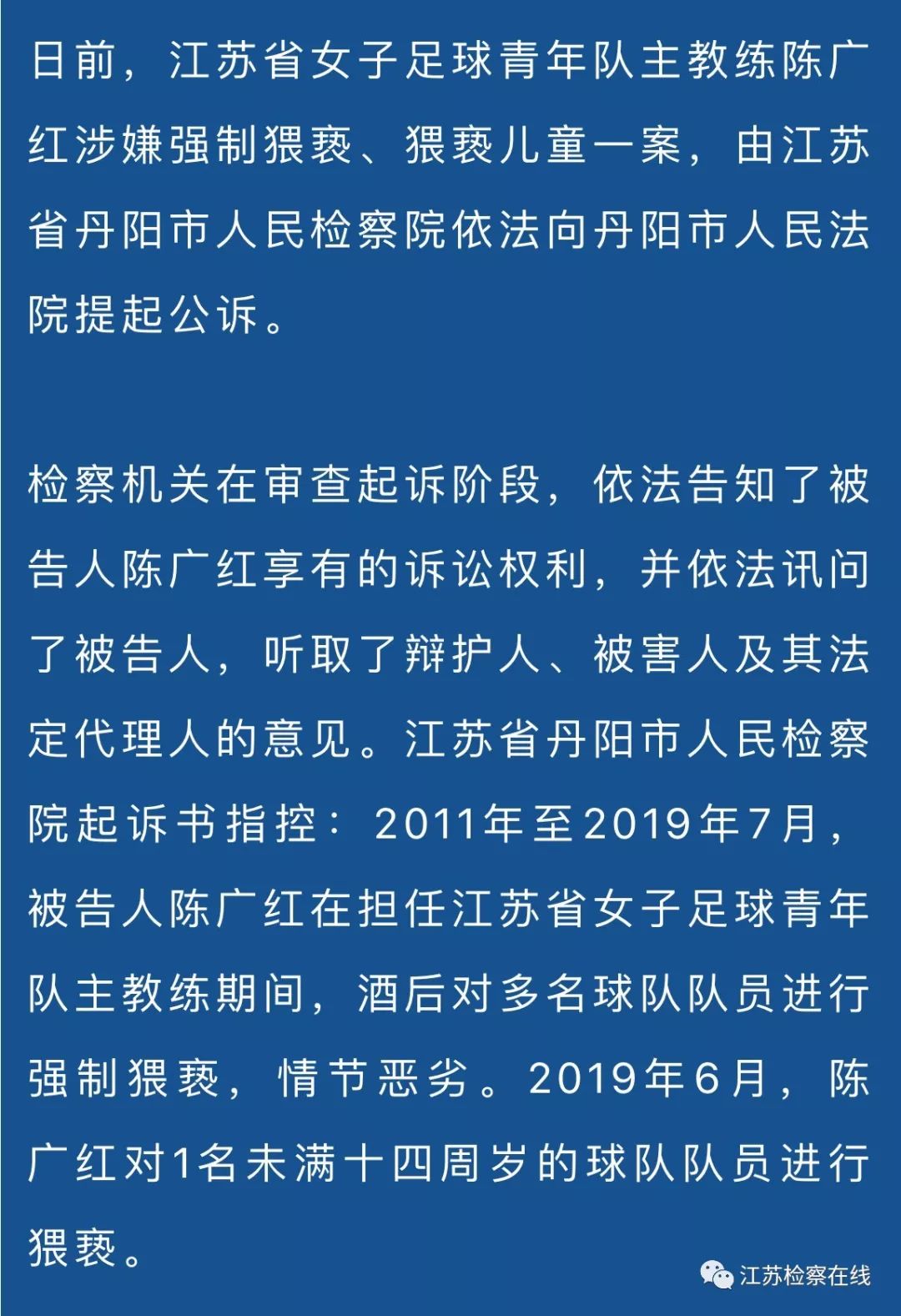 江苏检察在线微信号12月25日消息,江苏省丹阳市检察院对江苏省女子足球青年队主教练陈广红涉嫌强制猥亵、猥亵儿童案提起公诉。