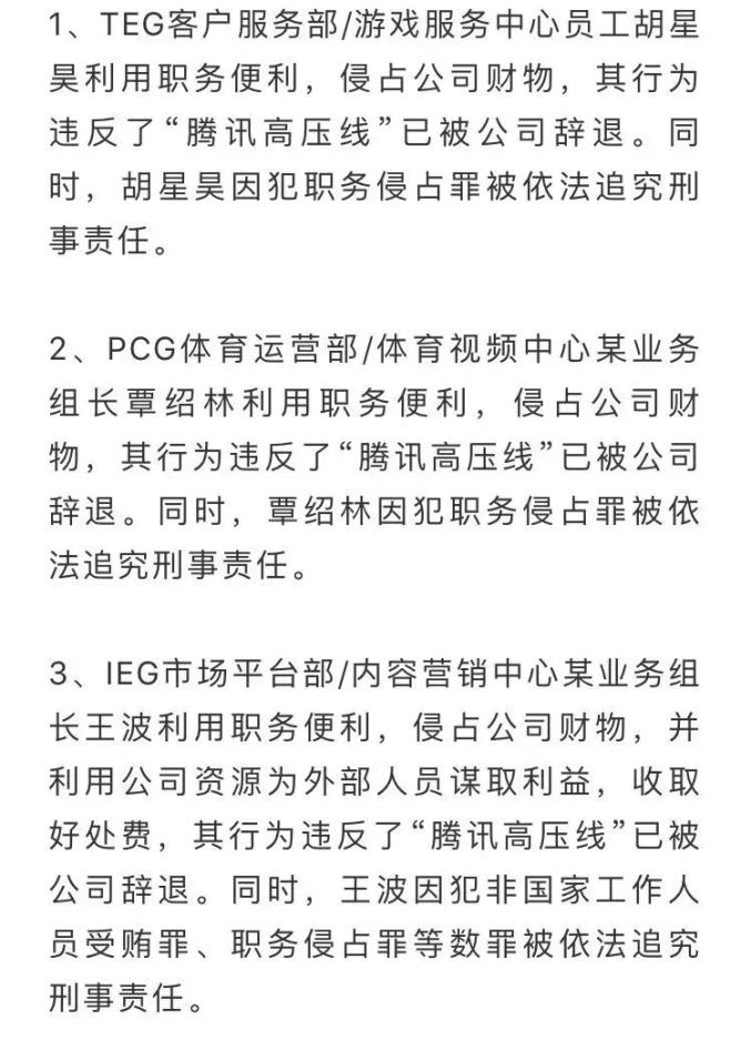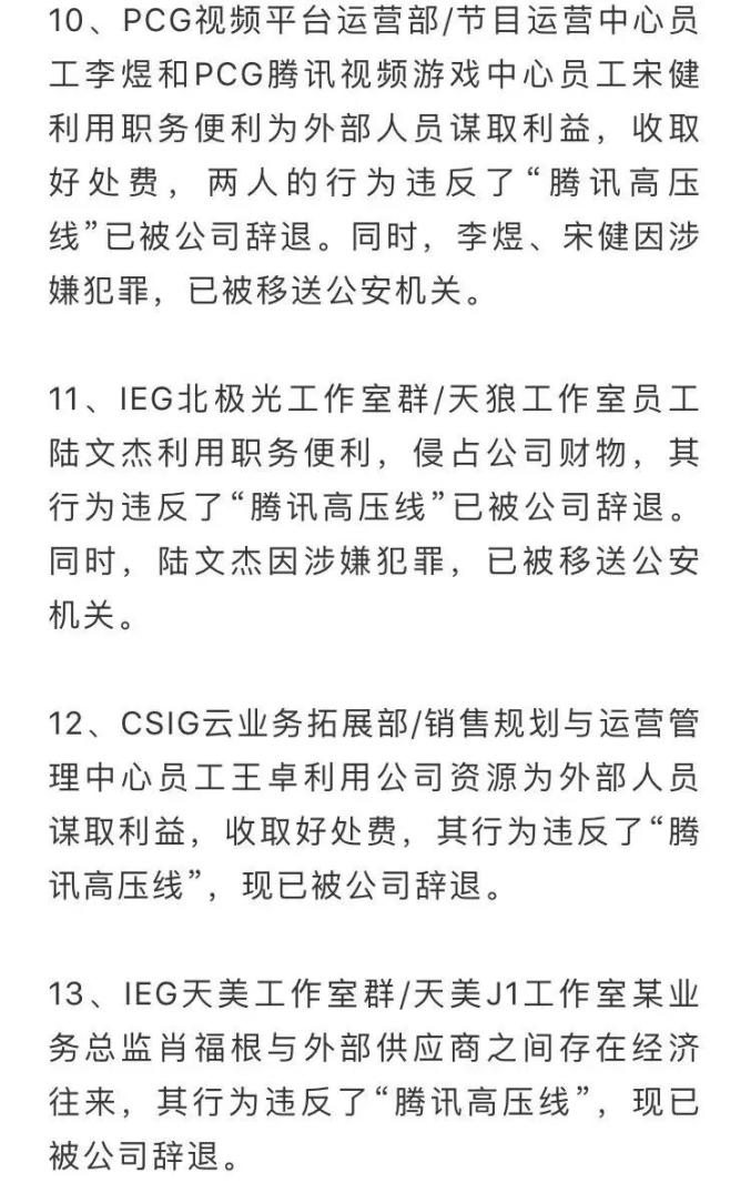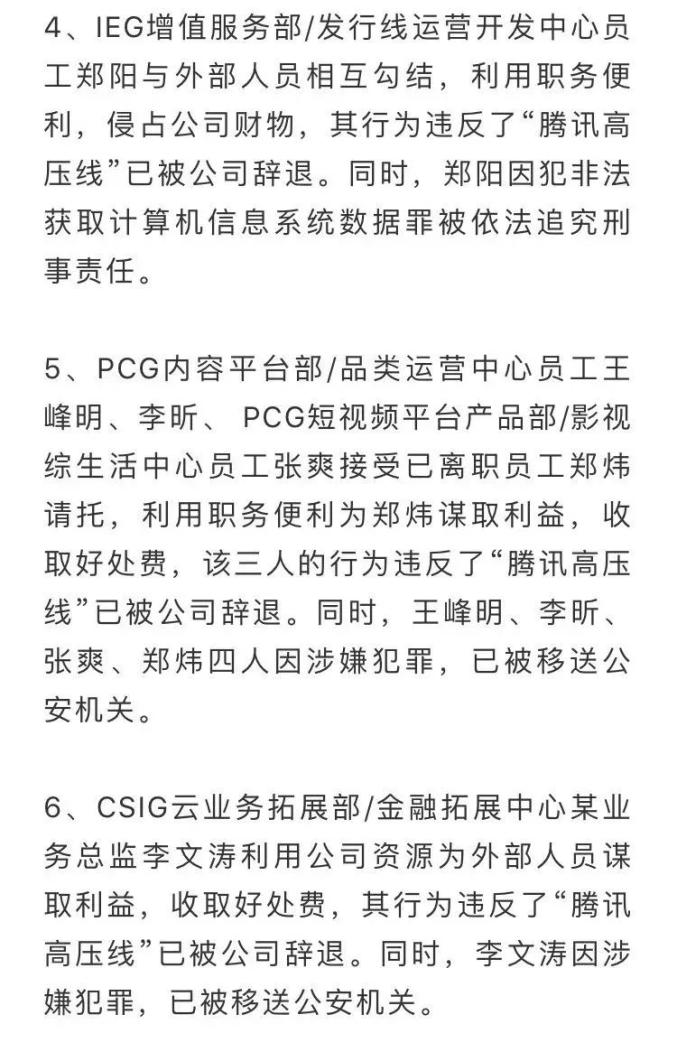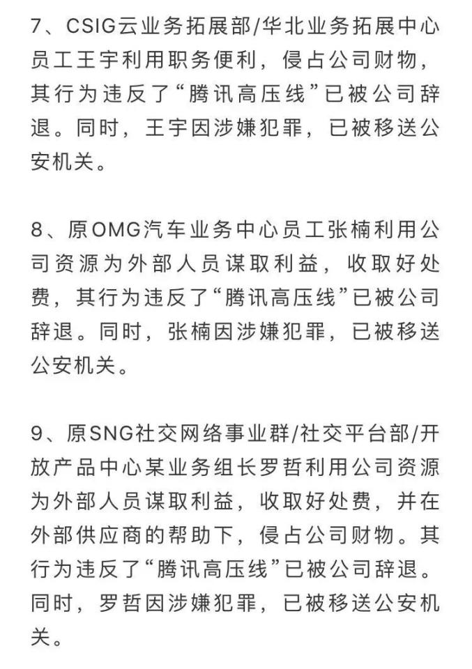 腾讯方面称,令人惋惜和痛心的是,仍有极少数员工未能抵挡住利益诱惑,利用职权做出了损害公司利益的行为,伤害了客户及合作伙伴对腾讯的信任,甚至以身试法,一步步迈入违法犯罪的深渊,对员工自身包括对其家人都造成了无可挽回的伤害。