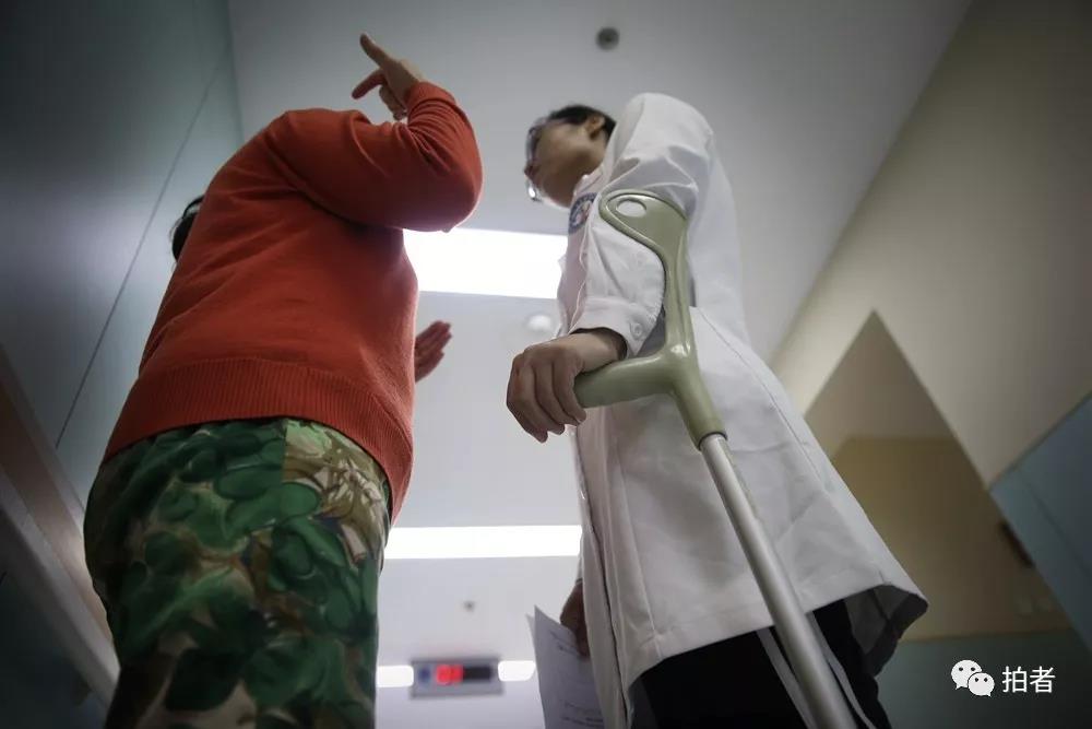 △10月16日,北京大学首钢医院安宁疗护中心走廊,腿部受伤的曹凤医生拄拐巡房时,遇到了一位向她咨询问题的病人家属。