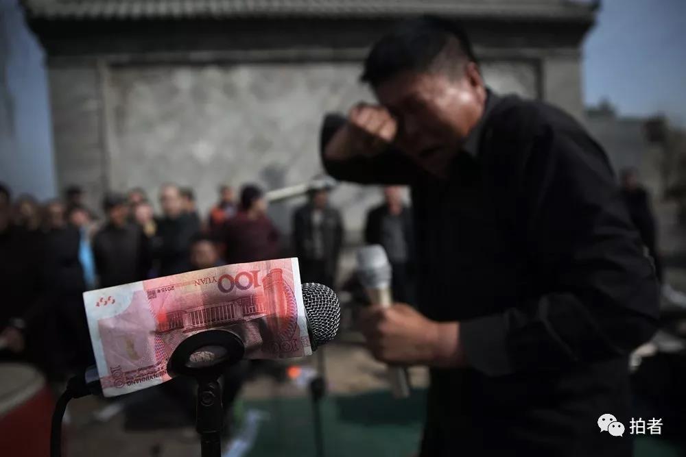 △3月22日,山西省平遥县,三平在葬礼上表演哭唱,麦克风上夹着主家给的赏钱。