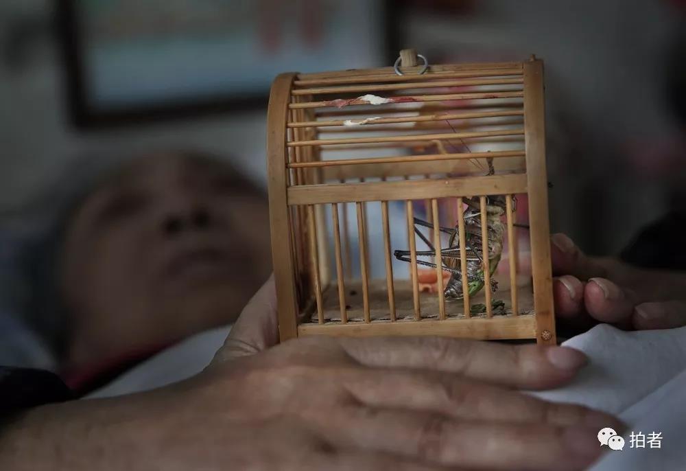 △3月14日,北京松堂医院,一位卧床的老人拿着自己养的蝈蝈。她说:“蝈蝈又叫百日虫,但我养的蝈蝈都能活过一百天。”