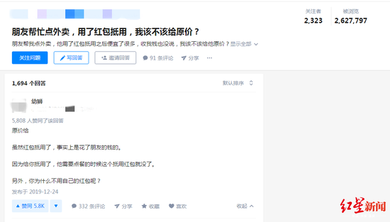 一瞬间,“朋友帮忙点外卖,用了红包抵用,该不该给原价”这个看起来简单的疑问似乎成了大难题,知乎上,两百多万网友纷纷围观,想要得到一个正确答案。