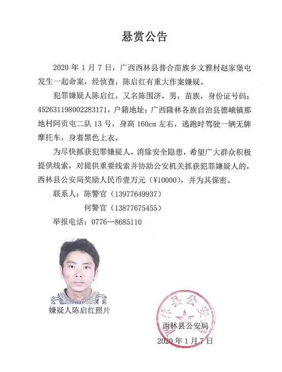 2020年1月7日,广西西林县普合苗族乡文雅村赵家堡屯发生一起命案, 经侦查,陈启红有重大作案嫌疑。