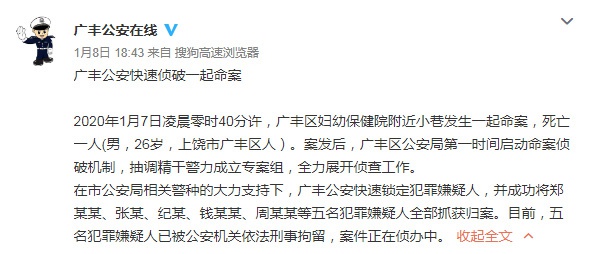 江西省上饶市广丰县公安局官方微博@广丰公安在线 1月8日18:43 通报称,1月7日凌晨零时40分许,广丰区妇幼保健院附近小巷发生一起命案,死亡一人(男,26岁,上饶市广丰区人)。案发后,广丰区公安局第一时间启动命案侦破机制,快速锁定了犯罪嫌疑人,并成功将郑某某、张某、纪某、钱某某、周某某等五名犯罪嫌疑人全部抓获归案。