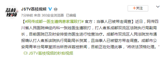 近日,网传四川省人民医院神经内科一张姓医生遭殴打,打人者系成都双流区法院执行局副局长,目前医院已及时安排受伤医生进行检查治疗。成都市双流区人民法院发布通报确认打人者系该院执行局副局长贺某,且当事人已被警方带走调查。成都市公安局青羊分局草堂派出所告诉荔枝新闻,目前正在处理此事,“将依法顶格处理。”