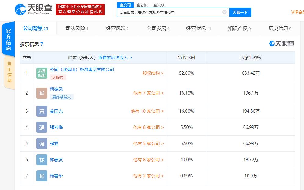天眼查数据显示,武夷山市大安源生态旅游有限公司成立于2003年10月,注册资本1218万,法定代表人为杨端凤,公司经营范围为旅游项目开发,旅游服务。公司最大股东为苏闽(武夷山)旅游集团有限公司(杨端凤持股70.00%),持股比例52%;杨端凤持股16.1%,为公司第二大股东;强雯持股5.5%,为公司第四大股东。