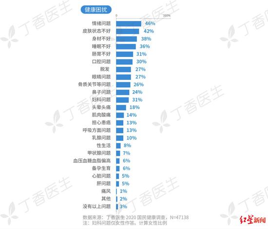 关于“健康困扰”方面的数据则显示,97%的受调查者表示自己存在健康相关的困扰,其中排名前三的分别是:情绪问题、皮肤状态不好、身材不好。相比2018年最大的健康困扰是皮肤问题,可见2019年大家确实是“太南了”。
