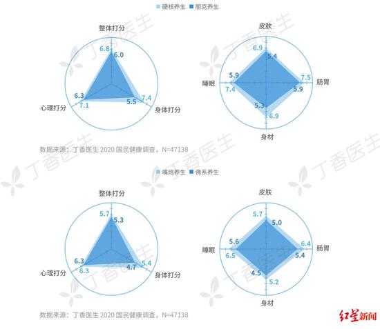 对这四类人群进行对比发现,“硬核养生”人群理所当然最容易达成良好的健康状态。与此同时,“朋克养生”和“佛系养生”人群尽管是对健康都没有什么期待和要求的,但默默努力的“朋克养生”人群各项健康状态优于“佛系人群”。