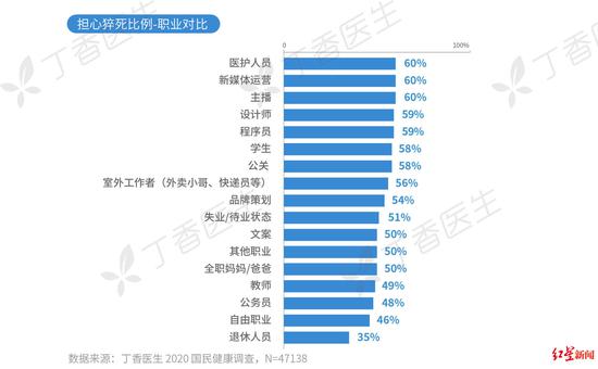 数据显示,53%的受试者都有过猝死的担心,其中6%的人经常担心甚至每天担心。那些工作时长较长的人,对猝死的忧虑更甚。工作强度较大的医生、媒体人、主播等,及久坐不动伏案较多的设计师、程序员等,担心猝死的比例更高。而学生中担心自己猝死的比例,竟高达58% 。