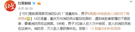 14日凌晨,重庆万州消防员出警后吃面时,遇到被救者家属的下跪致谢,要请消防员吃这碗面。5年前,男子3位亲人在火灾中被困,救人的消防员就在这其中。消防员:灭火救人是职责所在。致敬!