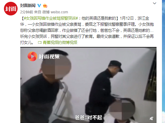1月12日,浙江金华,一小女孩因做错作业被父亲责骂,委屈之下报警找警察蜀黍评理。小女孩抱怨称父亲总喝醉酒回家,作业做错了还会打她,爸爸也不会,英语还是她教的…听完小女孩哭诉,民警对其父亲进行了教育。最终父亲道歉,并保证以后不会再打女儿。